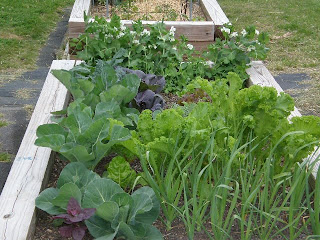 I had to include a photo of the vegetable bed that holds all of the greens, the sugar snap peas, the cauliflower, bok choy, mustard, and now new tiny seedling beets and carrots. I gave all my vegetables and my strawberries a dose of fertilizer last week, and the effect really shows. If your plants seem to be just sitting still in the garden and not growing, consider whether some Nitrogen is in order.